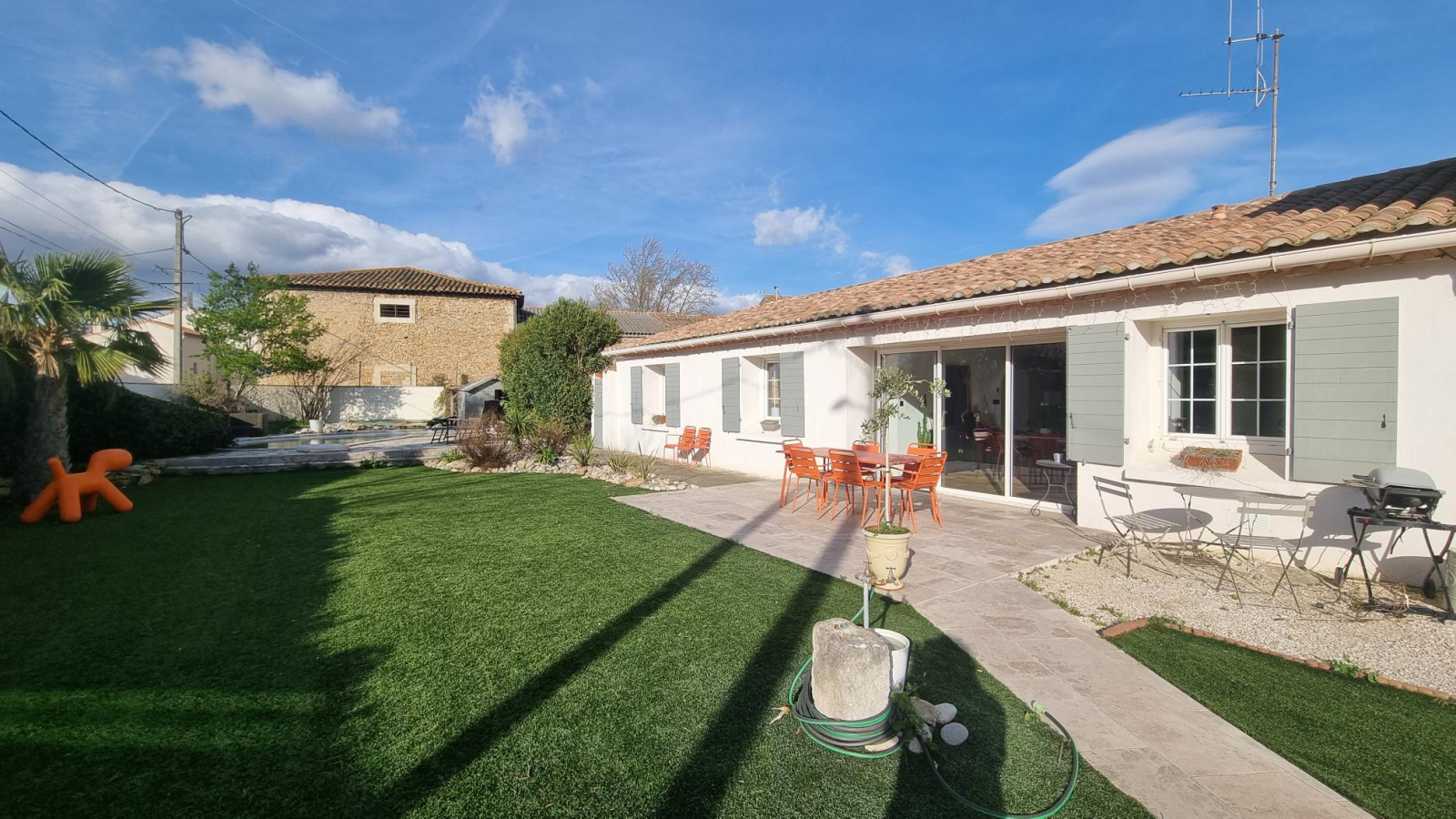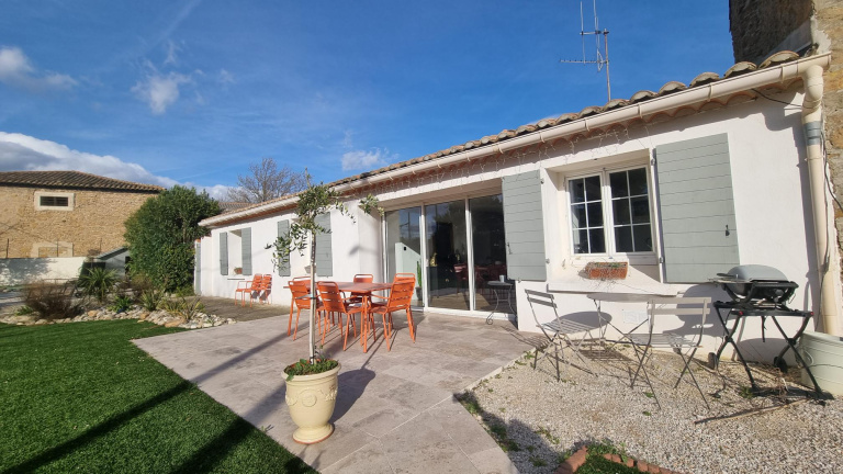 Entièrement rénovée avec goût, cette maison de plain-pied vous séduira par sa luminosité et ses volumes bien pensés. Elle offre une belle pièce de vie avec cuisine ouverte, baignée de lumière grâce à une grande baie vitrée donnant sur une agréable terrasse.