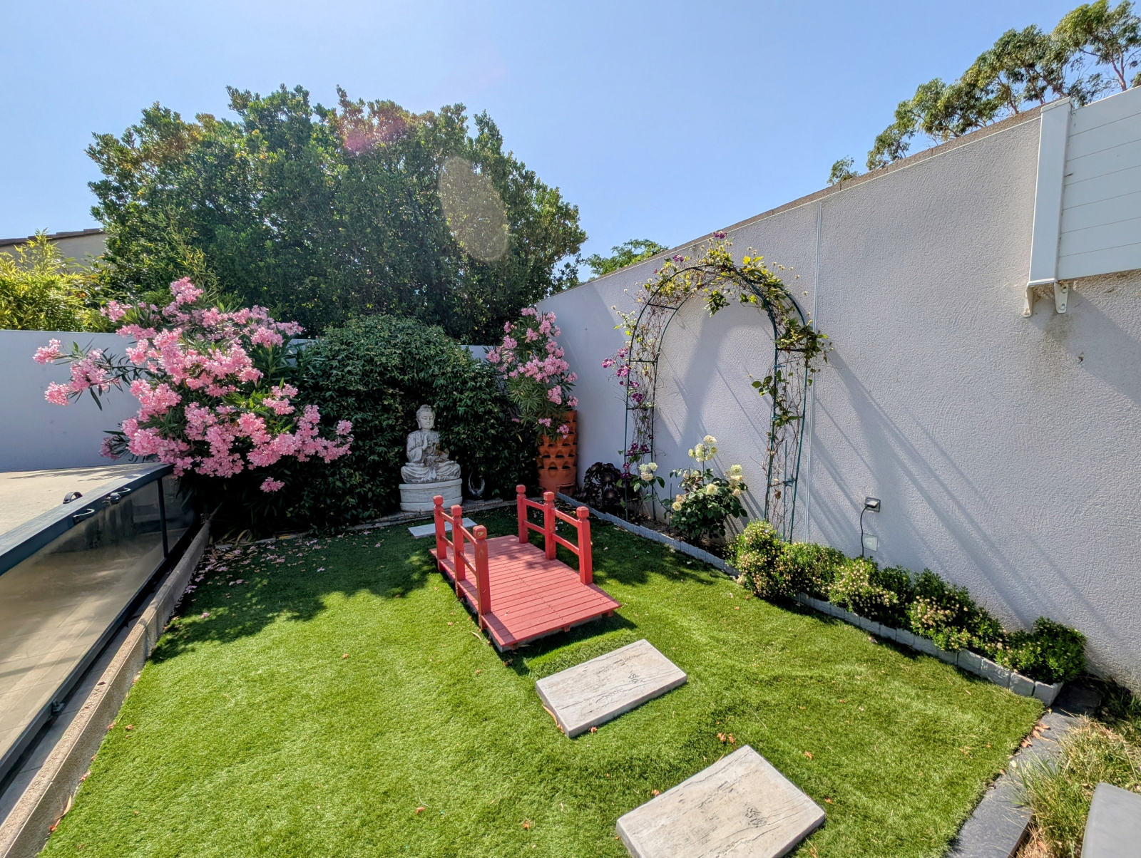 Le terrain de 820m², entièrement aménagé par un paysagiste, dispose d'un jardin potager, d'un forage, d'un système de goutte à goutte, d'une piscine au sel 8x3.50m avec dôme, d'une pergola bioclimatique, de deux cabanons, d'un local piscine avec douche et WC, ainsi qu'une douche solaire. Un garage isolé et carrelé complète ce bien, accessible directement depuis la maison.